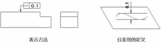 示例1:在給定平面內(nèi),公差帶必須在距離為0.1mm的兩平行直線間的區(qū)域。