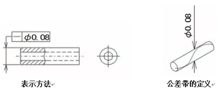 示例2:在公差值前加注記號(hào)Φ、則公差帶必須在直徑0.08mm的圓柱面內(nèi)的區(qū)域。