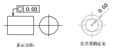 示例:公差帶必須在同一正截面上,半徑差為公差值0.03mm的兩個(gè)同心圓之間的區(qū)域。