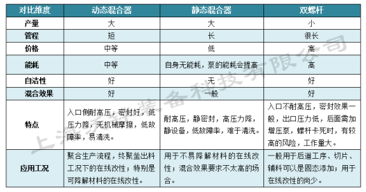 螺桿產(chǎn)能有限,生產(chǎn)線產(chǎn)能也受限;靜態(tài)混合器混合設備占地面積大、壓降大、混合效果差,并且內部死角多,死角處的物料長期不流動會導致降解炭化,使*終產(chǎn)品有黑點,導致不合格;動態(tài)混合器相比靜態(tài)混合技術優(yōu)勢明顯,行業(yè)中也剛開始應用,但定型產(chǎn)品較少。